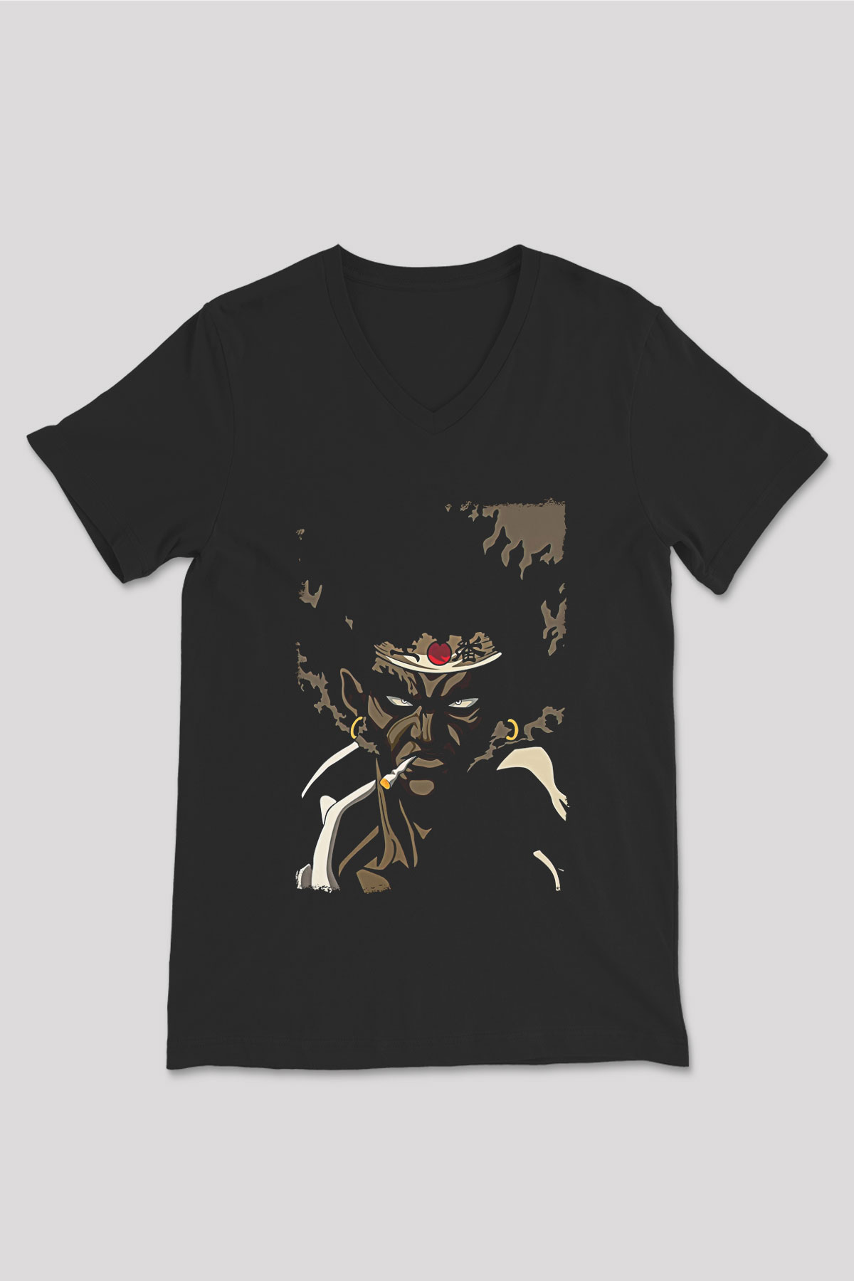 Afro Samurai Baskılı Unisex Siyah V Yaka Tişört - Tshirt