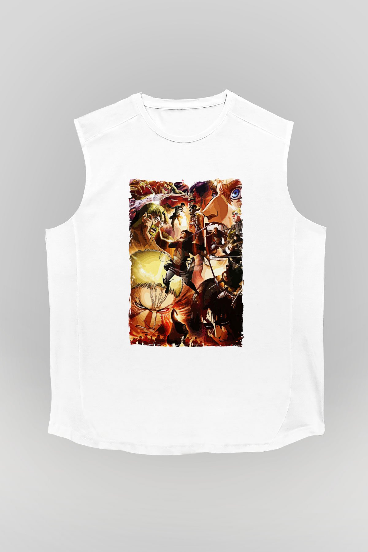 Attack On Titan Baskılı Beyaz Unisex Kolsuz Tişört - Tshirt