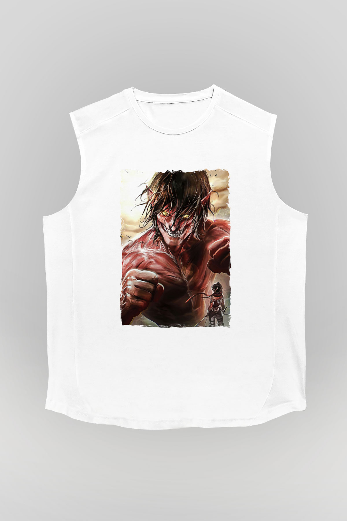 Attack On Titan Baskılı Beyaz Unisex Kolsuz Tişört - Tshirt (KK60742)