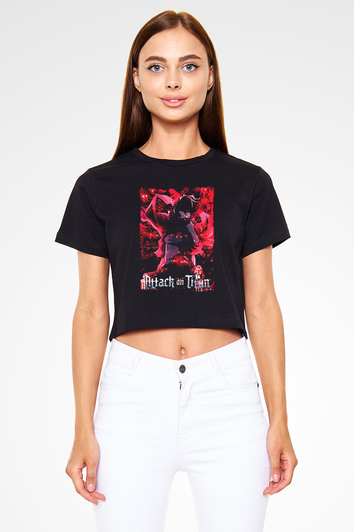 Attack On Titan Baskılı Siyah Crop Top Kadın Tişört - Tshirt