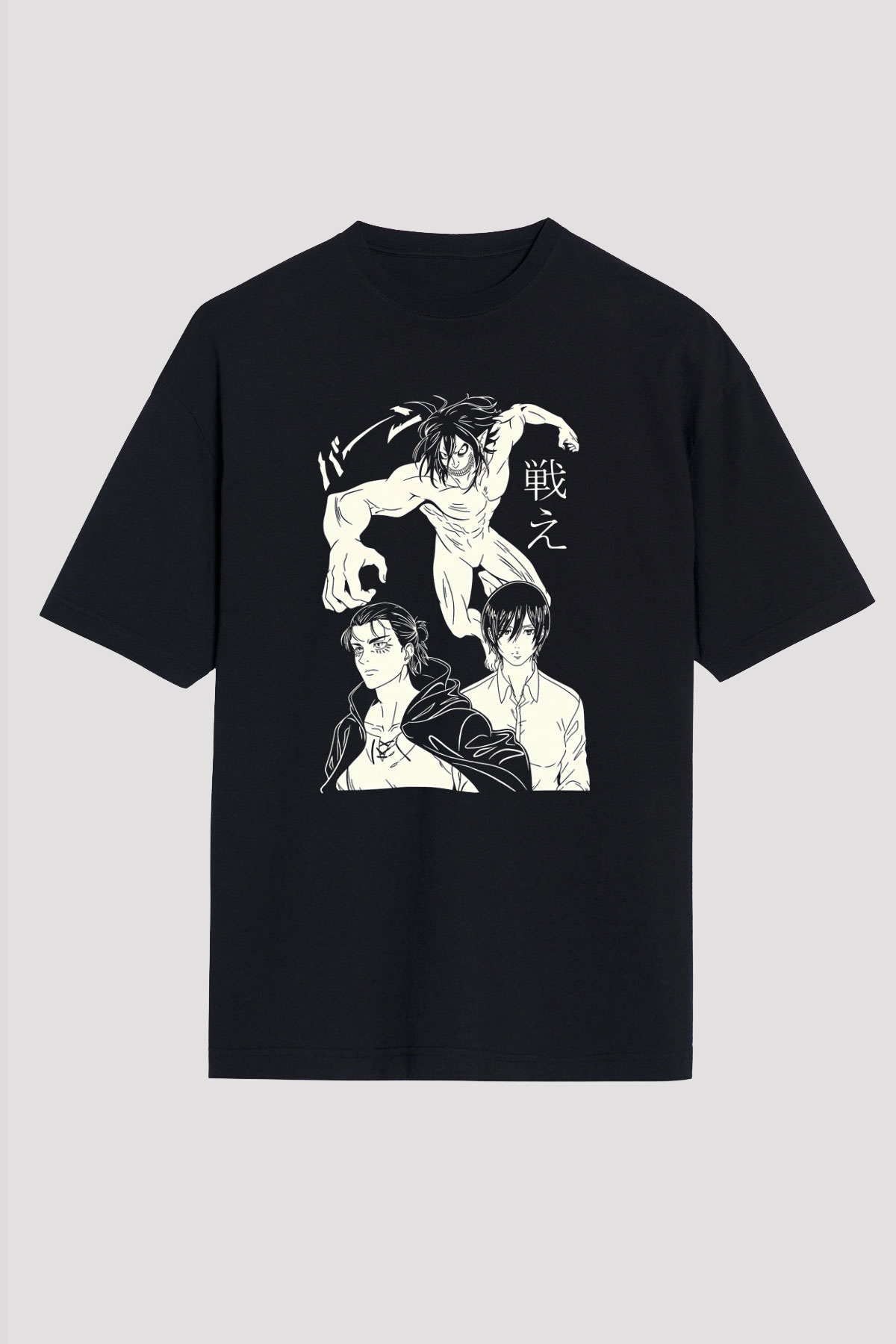 Attack On Titan Baskılı Unisex Siyah Oversize Tişört - Tshirt