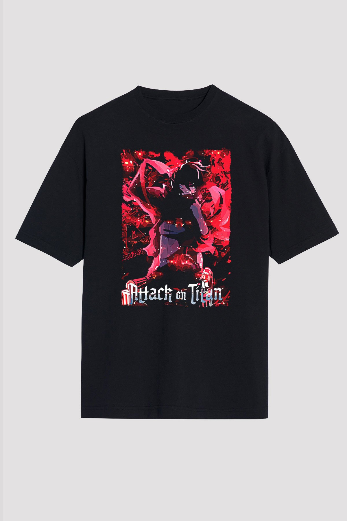 Attack On Titan Baskılı Unisex Siyah Oversize Tişört - Tshirt (OS56387)