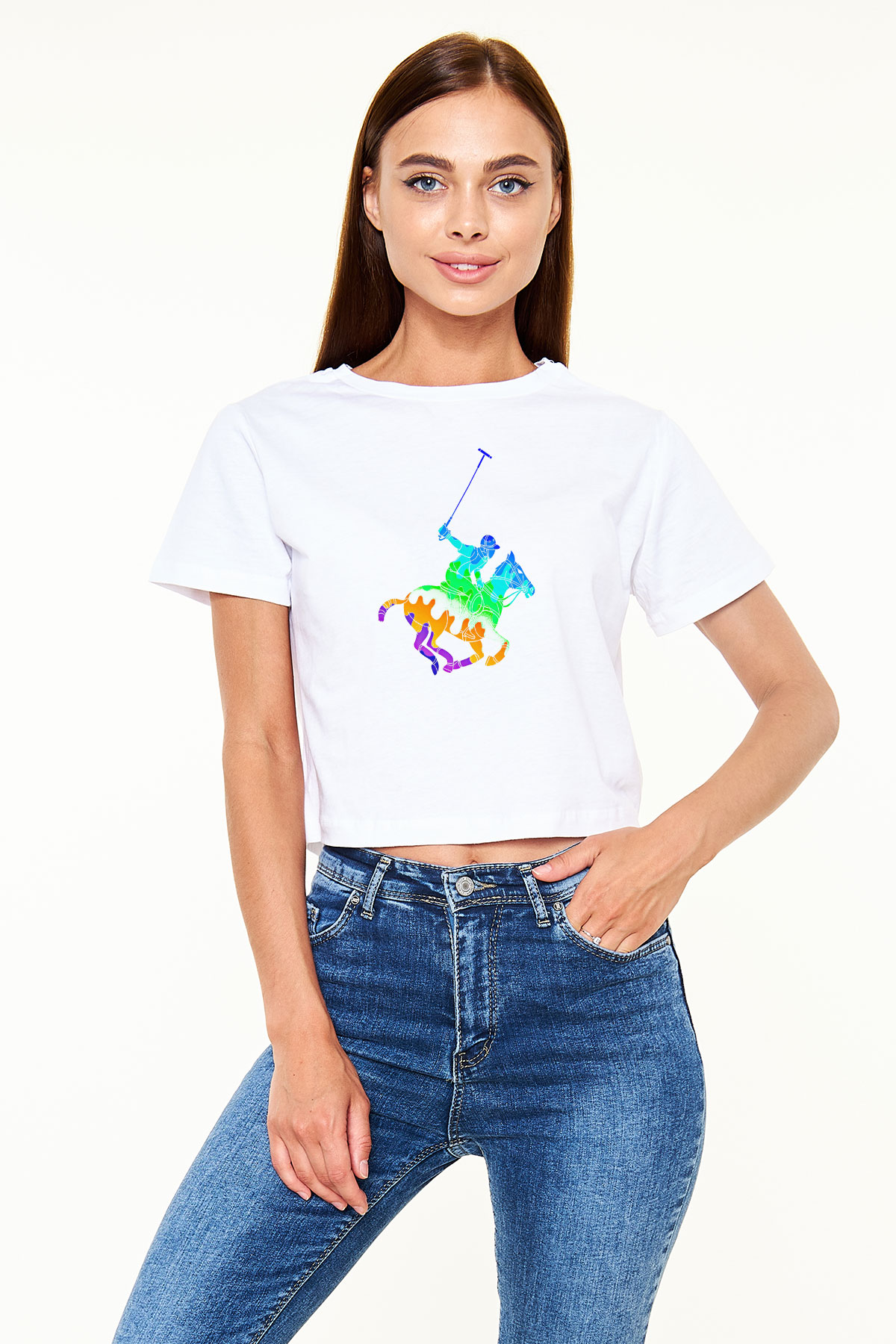 Binicilik Baskılı Crop Top Beyaz Tişört - T-shirt