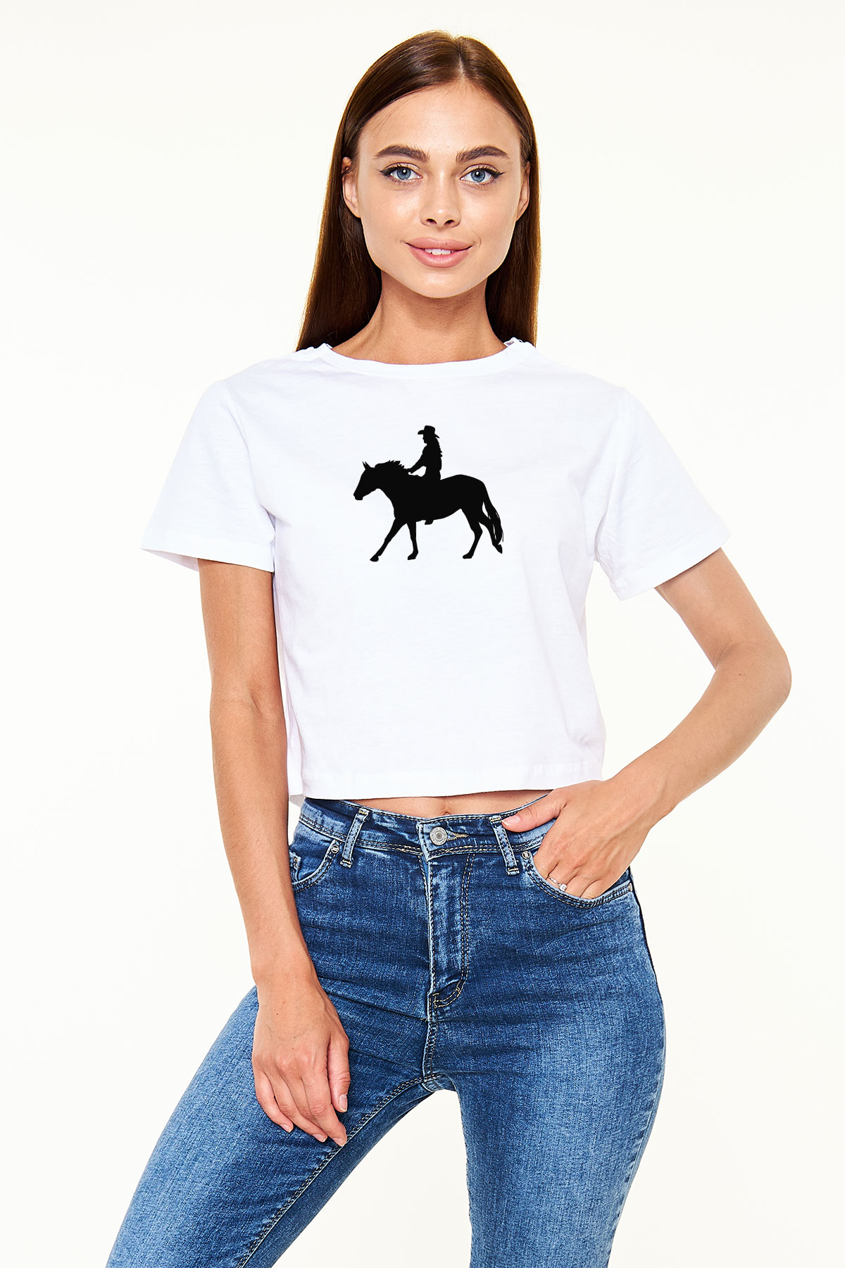 Binicilik Baskılı Crop Top Beyaz Tişört - T-shirt