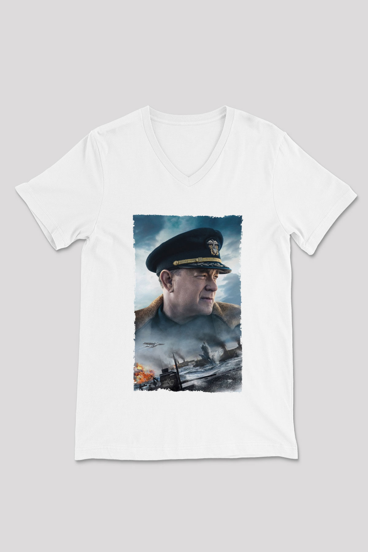 Unisex Atlantik Savaşı (Greyhound) Baskılı Beyaz V Yaka Tişört (VT19149)