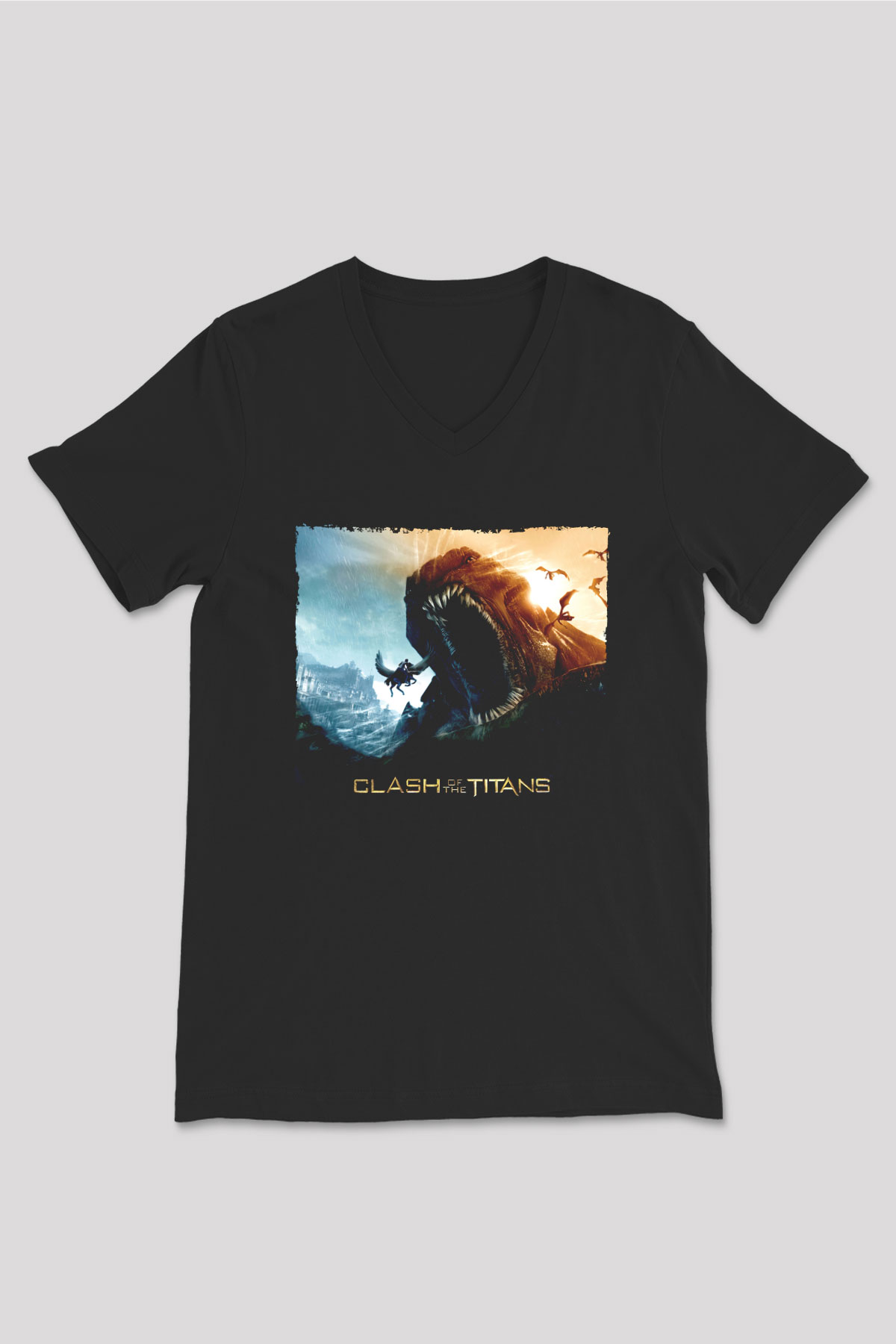Unisex Clash of the Titans Baskılı Siyah Unisex V Yaka Tshirt